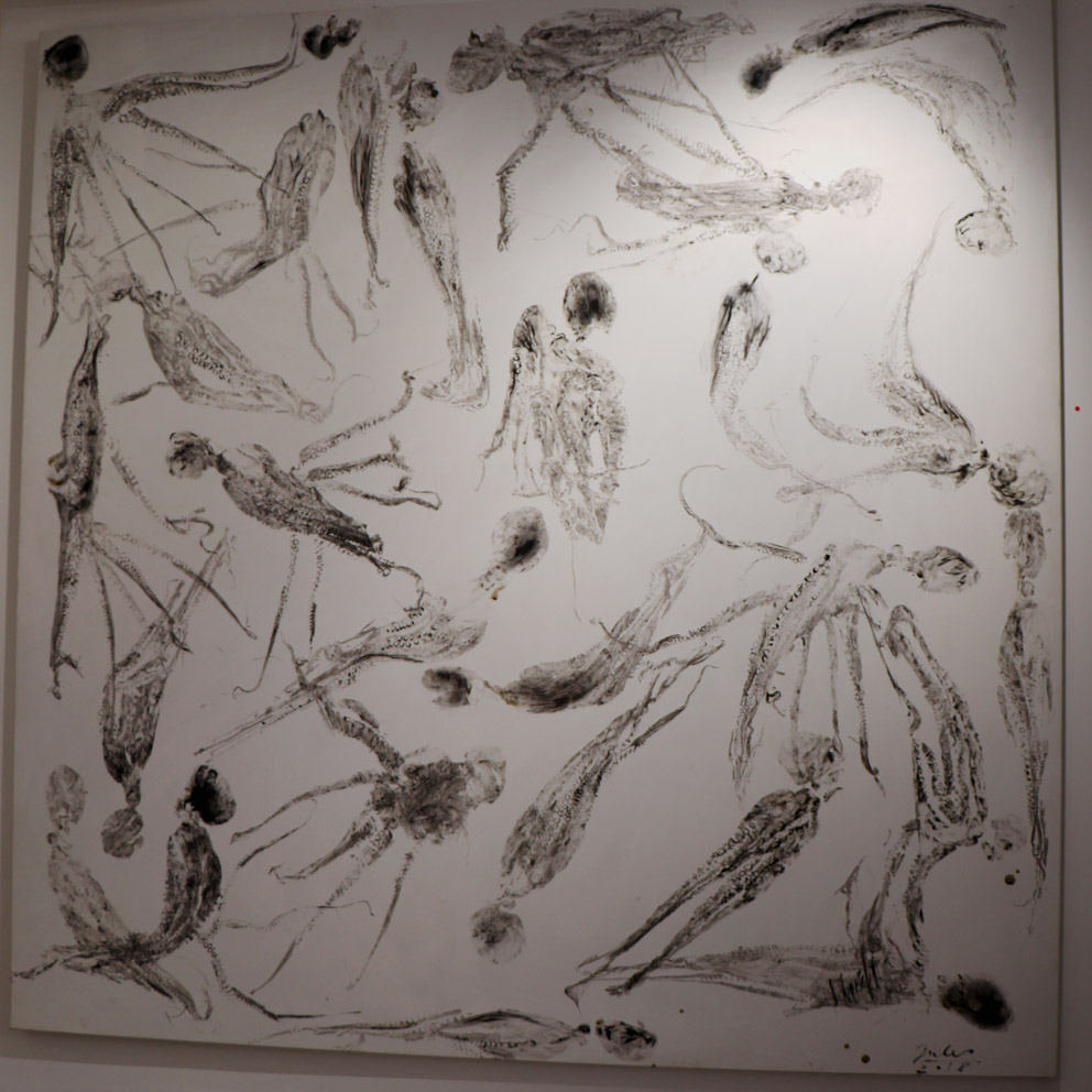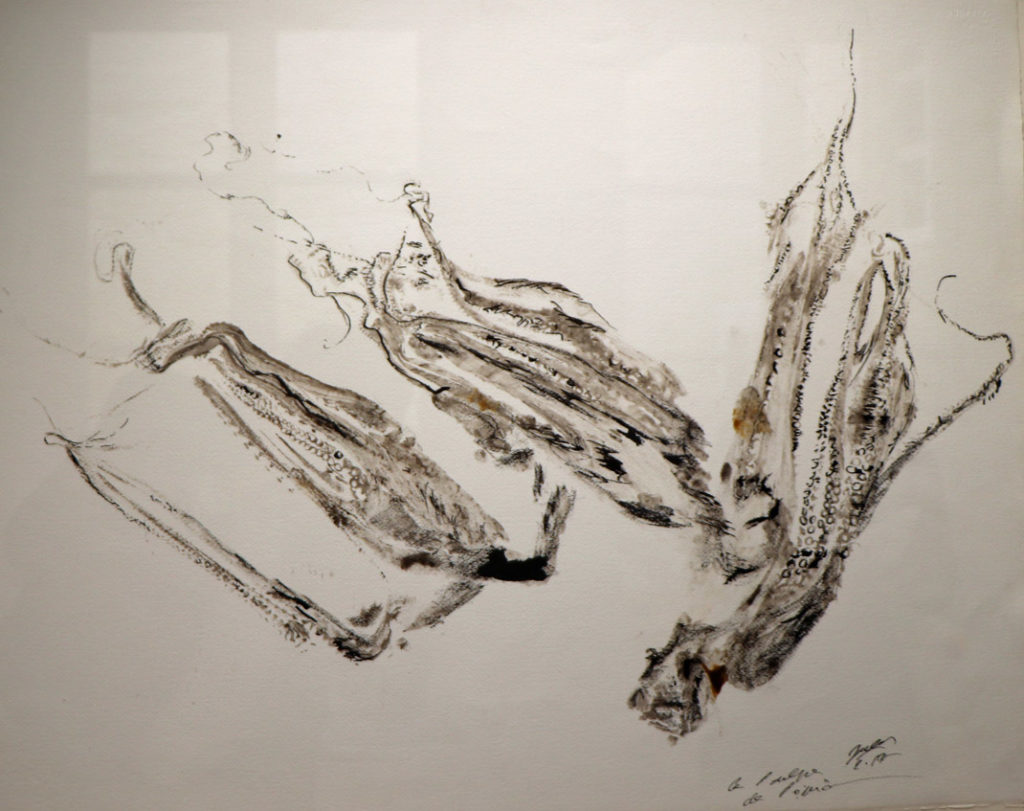Nous voyons ensuite une série de toile dont une aussi immense qu’intense : Les Poulpes. L’empreinte semblant si fraîche de ces amis marins pour une danse insolite, un gruppetto de tentacules excentriques.