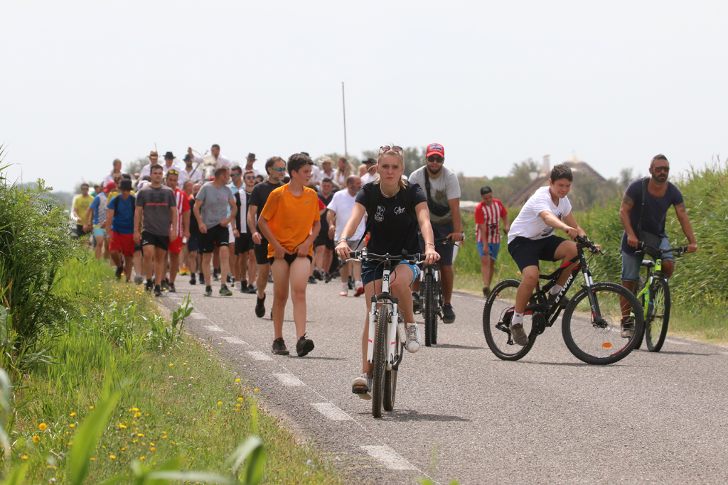 L’abrivado de la manade Chaballier est parti des Iscles vers 11h15mn. Le parcours, rectiligne ne présente pas de difficulté pour les gardians, par contre il traverse l’un des plus beaux paysages de la Camargue Gardoise. Entre les étangs du Charnier et du Crey le cadre est sublime et le cortège a évolué lentement, nous laissant le temps d’apprécier ces instants rares et précieux de communion entre nature et tradition.